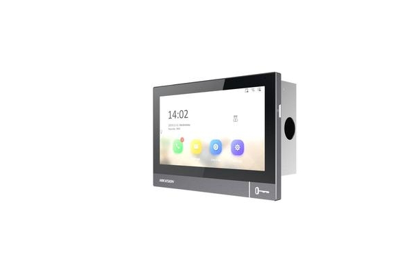 Postazione da interno IP 7", Profilo in metallo, Vetro temperato, 1 pulsante fisico per apertura porta, Display Tecnologia IPS LCD, Touch screen capacitivo. Funzioni: maschera voce, risposta a mani libere, studio professinale, lasciare un messaggio, log eventi. Risoluzione 1024x 600, Microfono omnidirezionale e Speaker integrati, Interfacce di Comunicazione 1 Ethernet 10/100 Mbps, 1 RS-485, Protocolli di Comunicazione Wi-Fi, TCP/IP, SIP, RTSP, 8 Input d'allarme, 4 Uscite relè, 1 microSD/SDHC/SDXC 32GB (non fornita), Alimentazione 12 Vcc, PoE (802.3 af) 7W max., Temperatura d'Esercizio -10 °C ~ +55 °C, Dimensioni 180x140x22.4 mm, Supporto a parete incluso e scatola di incasso art. DS-KABH8380-G. Accessori opzionali: Base tavolo art. DS-KABH8380-T.