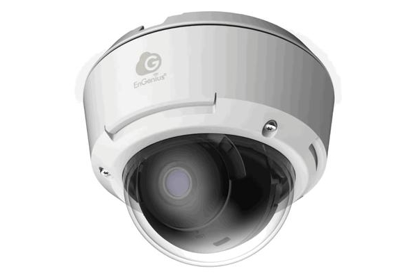 The EnGenius ECC100 Indoor/Outdoor 5MP Dome AI Camera with 132° ultra-wide view, 20-meter IR, IP67 outdoor rating, IK10 durability, and built-in 256GB storage.